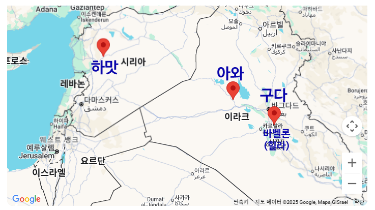 “앗수르 왕이 바벨론과 구다와 아와와 하맛과 스발와임에서 사람을 옮겨다가 이스라엘 자손을 대신하여 사마리아 여러 성읍에 두매 그들이 사마리아를 차지하고 그 여러 성읍에 거주하니라.” (24)