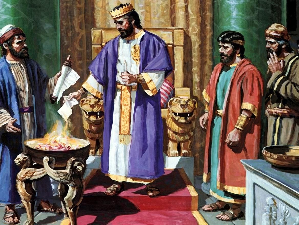 “여후디가 서너 쪽을 낭독하면 왕이 면도칼로 그것을 연하여 베어 화로 불에 던져서 두루마리를 모두 태웠더라. 왕과 그의 신하들이 이 모든 말을 듣고도 두려워하거나 자기들의 옷을 찢지 아니하였고 엘라단과 들라야와 그마랴가 왕께 두루마리를 불사르지 말도록 아뢰어도 왕이 듣지 아니하였으며 왕이 왕의 아들 여라므엘과 아스리엘의 아들 스라야와 압디엘의 아들 셀레먀에게 명령하여 서기관 바룩과 선지자 예레미야를 잡으라 하였으나 여호와께서 그들을 숨기셨더라.” (렘 36:23-26)