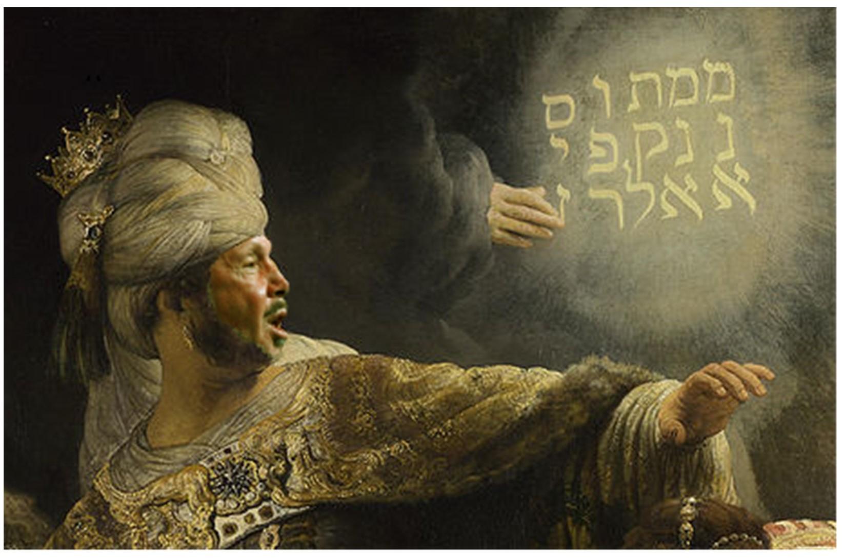 “그 때에 사람의 손가락들이 나타나서 왕궁 촛대 맞은편 석회벽에 글자를 쓰는데 왕이 그 글자 쓰는 손가락을 본지라 이에 왕의 즐기던 얼굴 빛이 변하고 그 생각이 번민하여 넓적다리 마디가 녹는 듯하고 그의 무릎이 서로 부딪친지라. 왕이 크게 소리 질러 술객과 갈대아 술사와 점쟁이를 불러오게 하고 바벨론의 지혜자들에게 말하되 누구를 막론하고 이 글자를 읽고 그 해석을 내게 보이면 자주색 옷을 입히고 금사슬을 그의 목에 걸어 주리니 그를 나라의 셋째 통치자로 삼으리라 하니라.” (단 5:5-7)