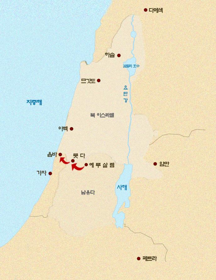 룻다는 지리적으로 팔레스타인 해안 평야 지대인 사론(Sharon) 평야에 위치한 도시입니다. 욥바(Joppa, 현대의 텔아비브/야파)에서 동남쪽으로 약 18km(약 9~11마일) 떨어져 있으며, 예루살렘으로 가는 길목에 있는 요충지입니다. 구약 시대에는 '롯(Lod)'으로 불렸으며(역대상 8:12), 베냐민 지파의 영토에 속했습니다. 오늘날에는 이스라엘의 로드(Lod, לוד)라는 도시입니다. 텔아비브의 남동쪽에 위치하며, 현대의 벤구리온 국제공항과 매우 가까운 곳에 있습니다.